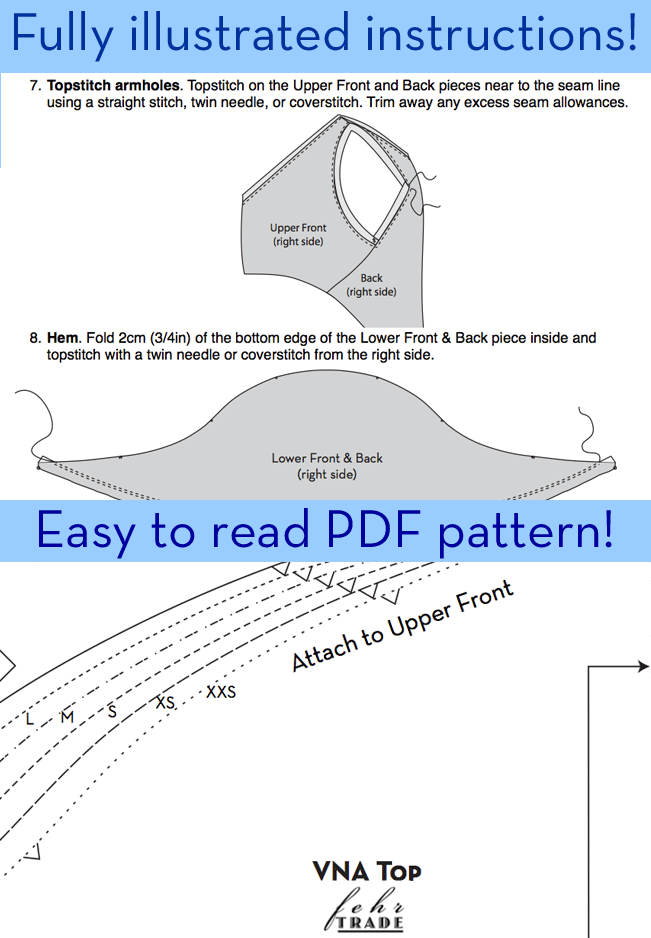1cm (3/8in) seam allowances are included throughout. A 2cm (3/4”) hem allowance is also included. Due to the unorthodox seamlines, I have also included diagrams showing how to make common fit adjustments to this pattern (in addition to my usual illustrated instructions!).