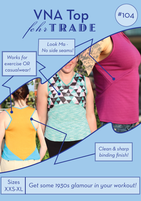 This is a pattern for a close-fitting, sleeveless workout top inspired by a 1930s Vionnet evening gown. It features a front V-neck, curved under bust seam, and distinctive angular seaming in back. Neckline and armhole edges are finished with binding, and there are no side seams.