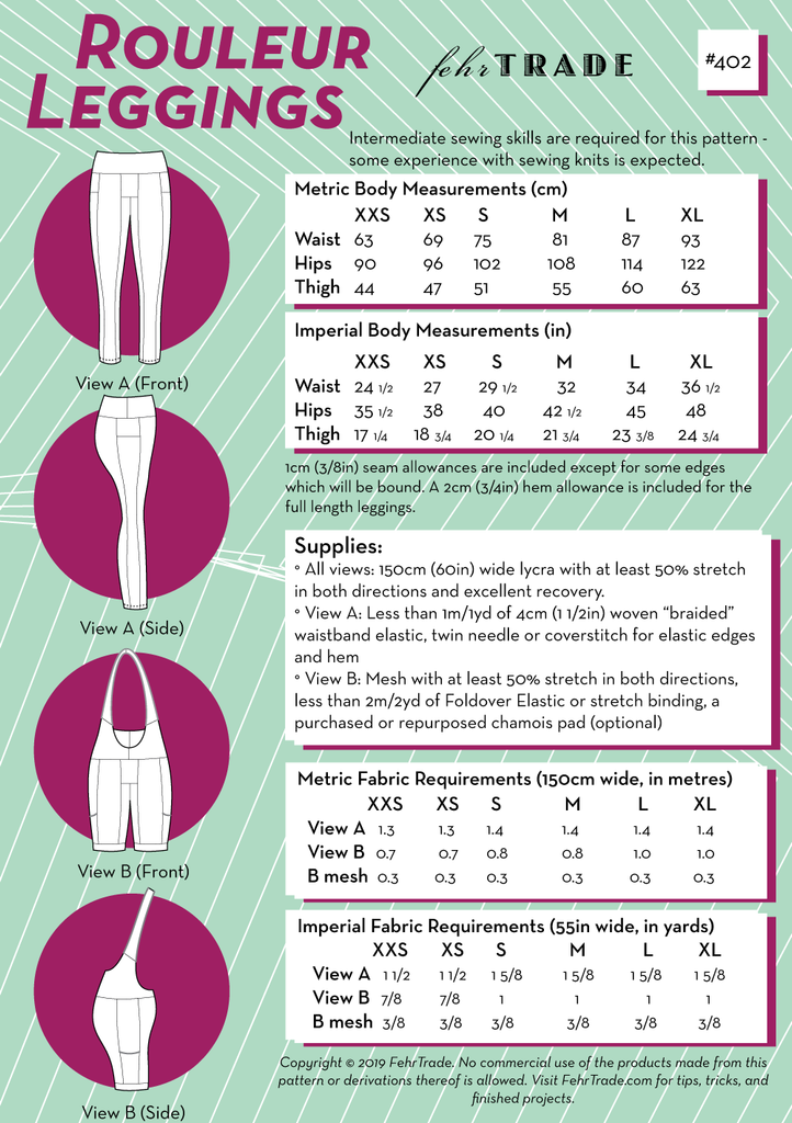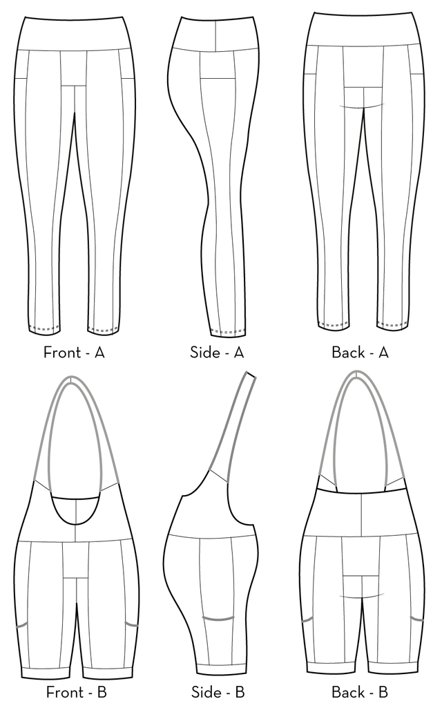 1cm (3/8in) seam allowances are included except for some edges of the pocket and bib on View B, where edges will be bound. A 2cm (3/4in) hem allowance is included for the full length leggings. Due to the unorthodox seamlines, diagrams showing how to make common fit adjustments to this pattern are also included in addition to the usual illustrated instructions.