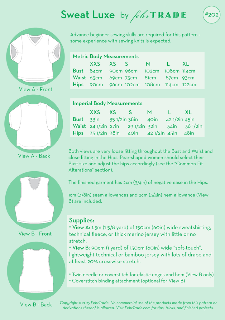 Advanced beginner sewing skills are required for this pattern - some experience with sewing knits is expected. 1cm (3/8in) seam allowances and 2cm (3/4in) hem allowance (View B) are included.