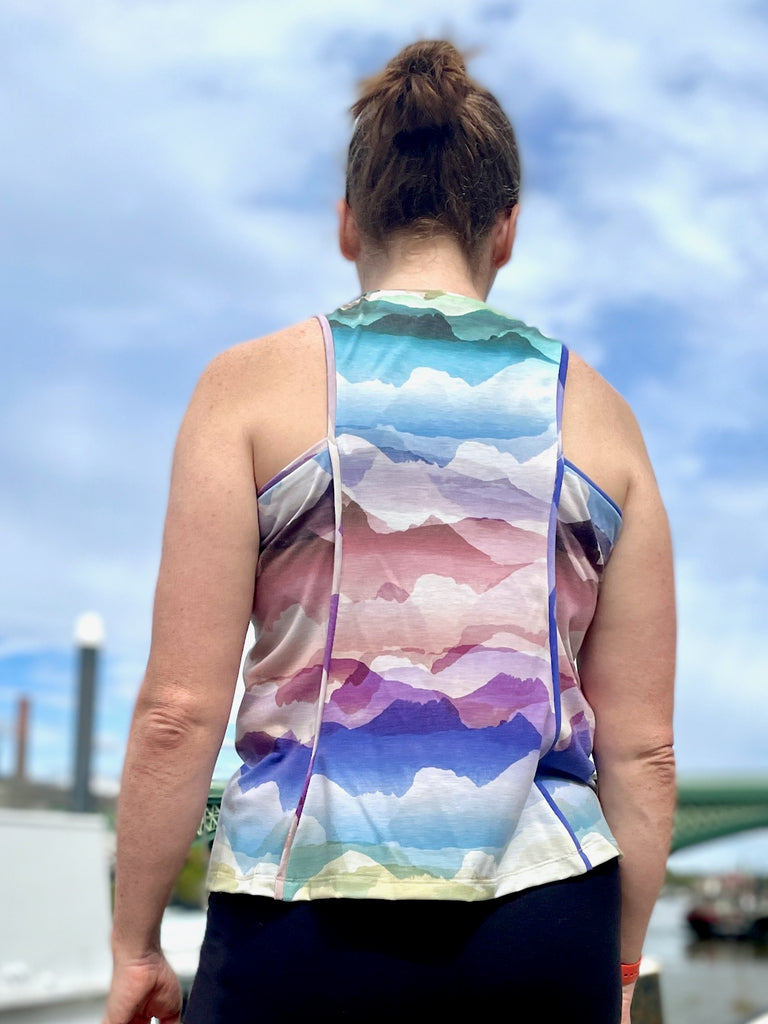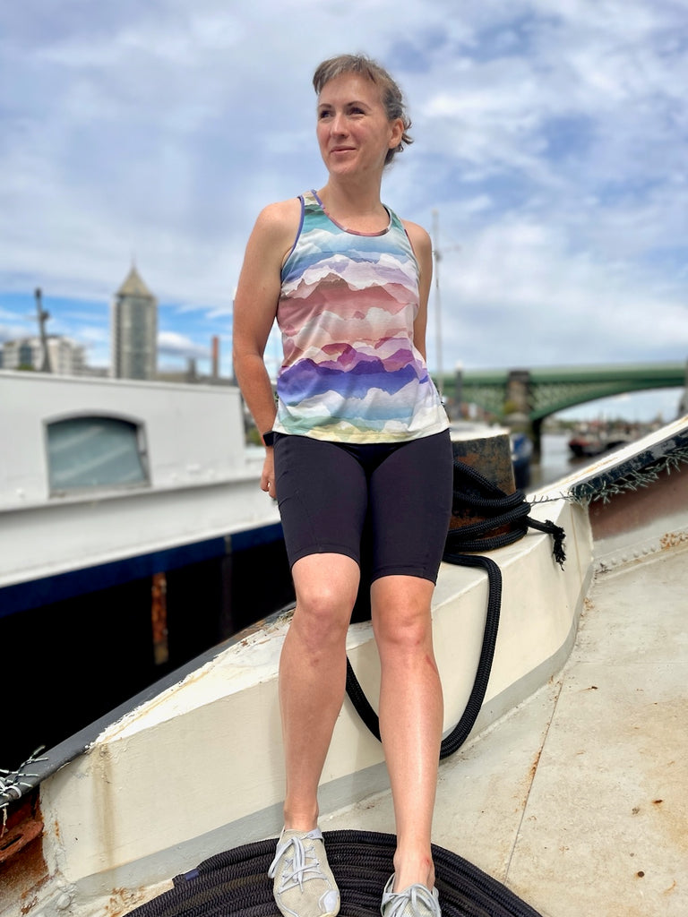 Eliminate underarm irritation with a top that has no side seams! This boxy workout top comes in two versions - a sleeveless Tank or a Tee with your choice of two sleeve lengths. Both are loose fitting and a feature banded neckline, with further armhole bands accentuating the unique back seaming on the Tank version.