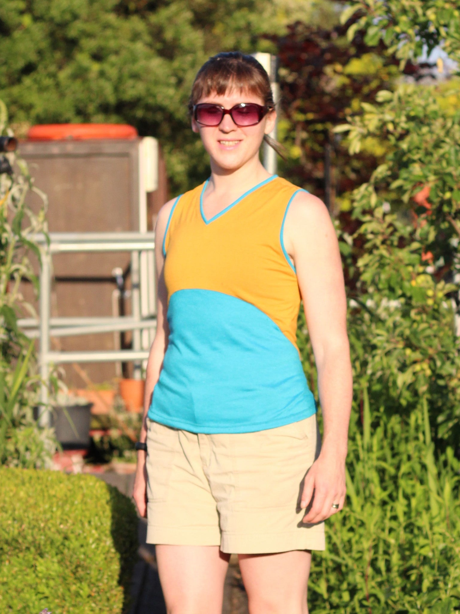 This is a pattern for a close-fitting, sleeveless workout top inspired by a 1930s Vionnet evening gown. It features a front V-neck, curved under bust seam, and distinctive angular seaming in back. Neckline and armhole edges are finished with binding, and there are no side seams.