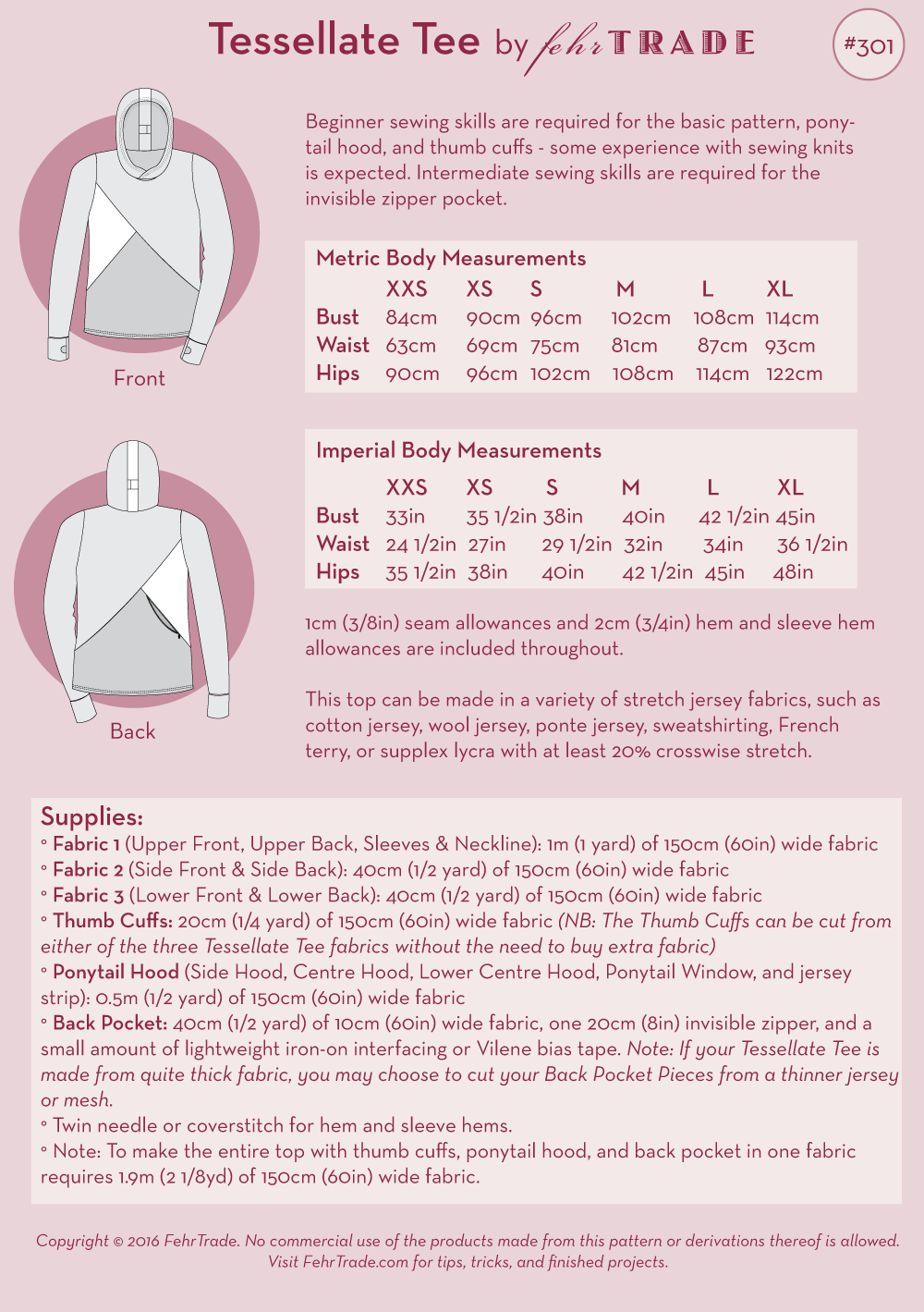- Thumb Cuffs: 20cm (1/4 yard) of 150cm (60in) wide fabric (NB: The Thumb Cuffs can be cut from either of the three Tessellate Tee fabrics without the need to buy extra fabric)